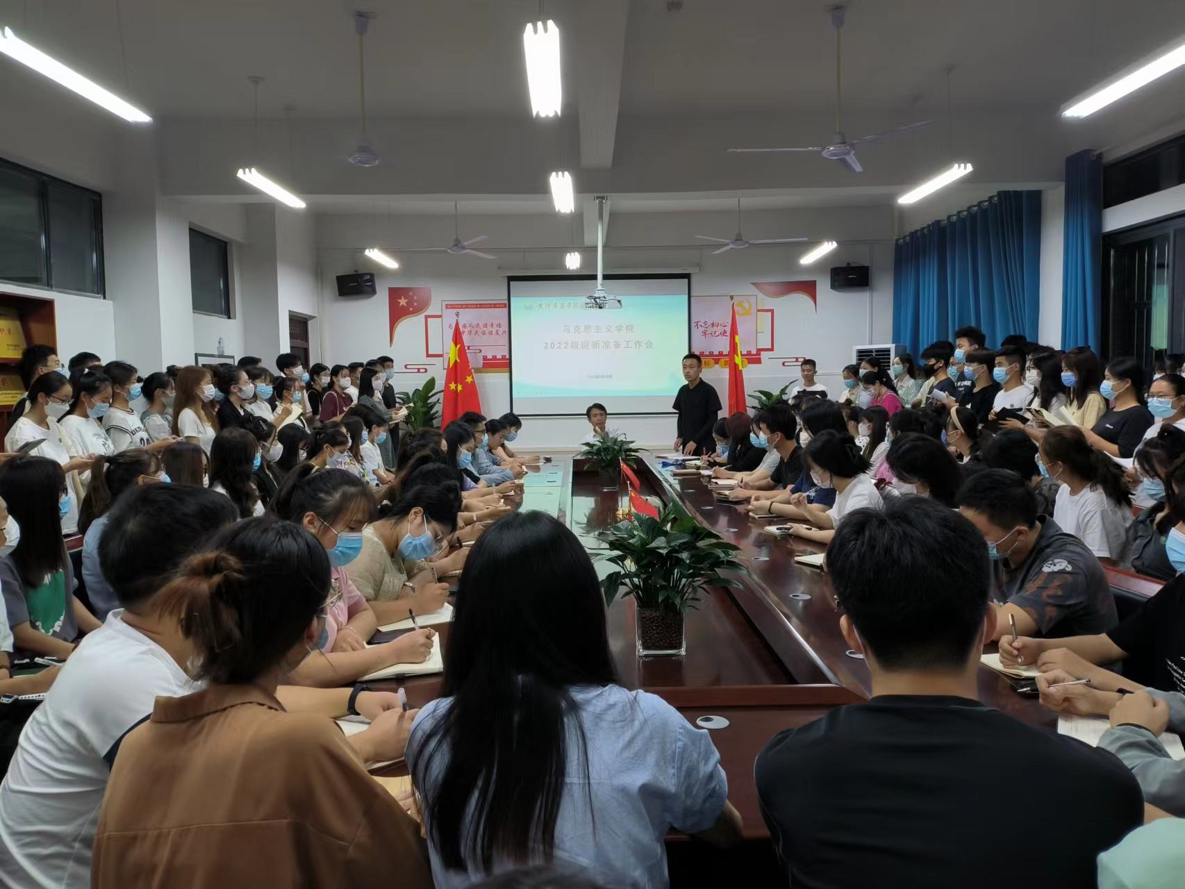 人心齐,泰山移。为展现tyc7111cc太阳成集团饱满的精神面貌,确保2022年新生迎新入学工作顺利进行,为新生营造一个“热情、周到、安全、有序”的接待环境,留给新生一个美好的马院初印象,tyc7111cc太阳成集团特于9月16日下午在辅导员许雪莹的主持下召开22级新生迎新准备工作会,党总支书记李元应参会并发表动员讲话,学院全体志愿者参加。