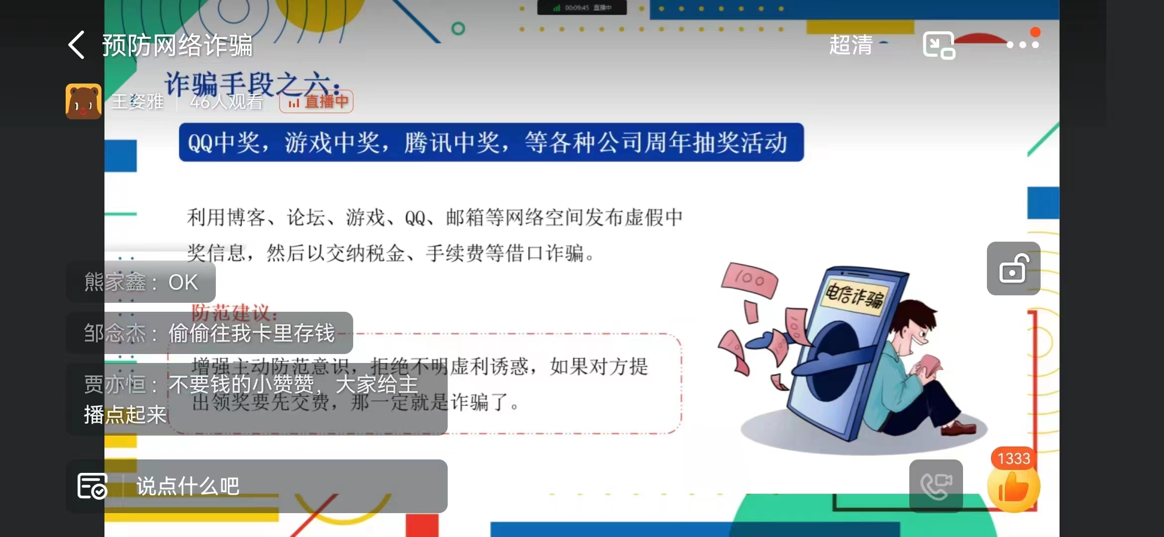 为进一步做好学院疫情防控期间的安全教育工作,切实保障同学们的财产安全,增强同学们防范电信网络诈骗的意识和能力。tyc7111cc太阳成集团于9月21日组织各班在线上开展了“筑建坚定防线,预防网络诈骗”主题班会。