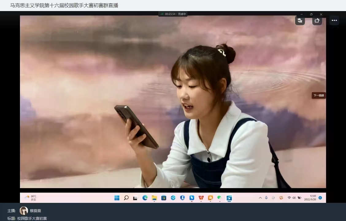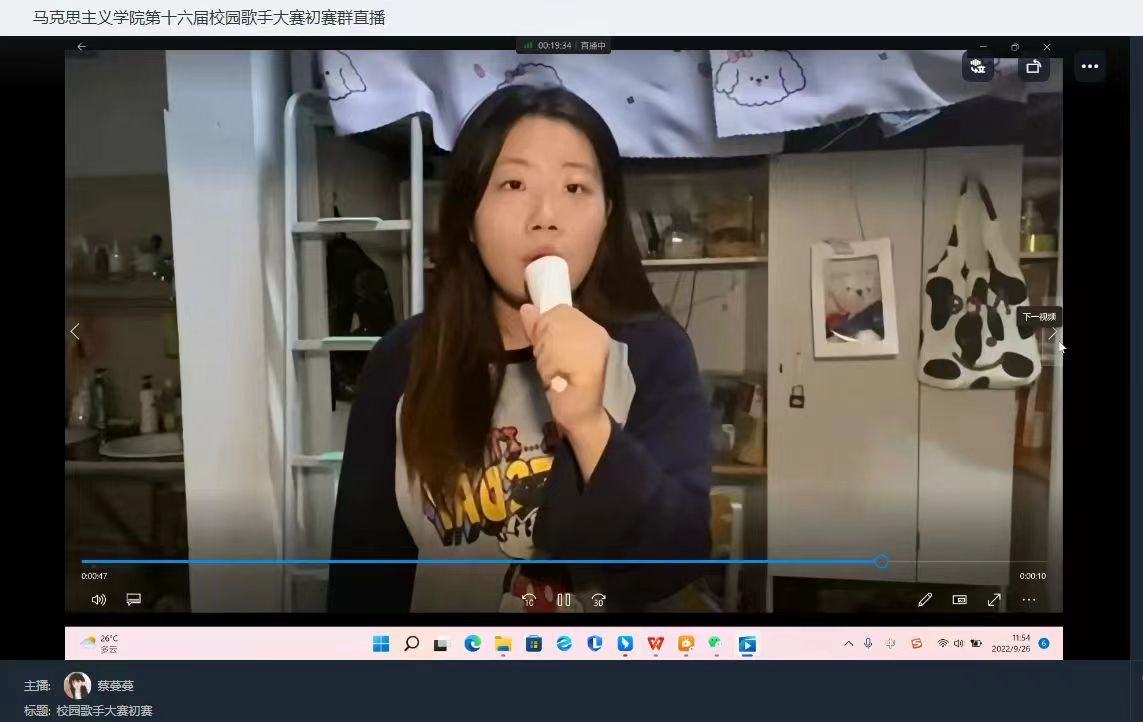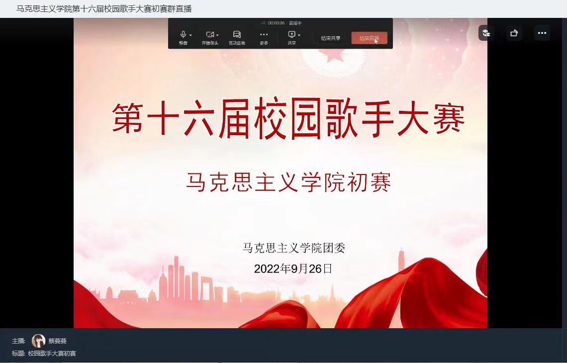 为全面贯彻落实党的十九大和十九届历次全会精神,大力营造迎接和学习宣传贯彻党的二十大的浓厚氛围,进一步丰富同学们的校园文化生活。tyc7111cc太阳成集团于9月26日上午在414教室举办了以“喜迎二十大、永远跟党走、奋进新征程”为主题的第十六届校园歌手大赛初赛。本次初赛采取线上作品征集、实时直播评比的比赛形式,并特邀学院辅导员许雪莹、刘雅琦、郭晶晶等老师担任本次大赛初赛评委。