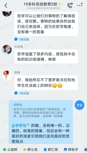 李星老师在教学过程中采用钉钉、网易公开课、中国大学慕课网等多种线上教学平台辅助教学。李星老师主要采用混合式教学形式,主要包括:在线点播教学视频、在线直播、互动答疑、在线作业等。李星老师采用课前以学生自主学习为主、课上以深化理论学习和互动讨论为主、课下以落实学生思考与写作为主的网上课程教学模式。课前,李星老师会认真备课,不仅提前看完点播给学生的视频,也做好课件便于直播和讨论答疑。上课过程中,李星老师会先提出本次课的思考主题,让同学们带着问题学习四十分钟左右的点播视频(点播视频采用武汉大学赵林教授的西方哲学史公开课),以便对课程内容有一定的了解和认识,然后李星老师会将所学的内容梳理一下,强调重难点,并提出相关问题与同学们一起思考。在互动答疑环节,李星老师鼓励同学们多提问、多发表自己的想法和思考,同学们也比较踊跃,相互提问、相互回答,气氛很活跃。每次讨论结束,李星老师会对此次讨论作出总结,并布置思考作业题以训练学生独立思考的能力和写作能力。