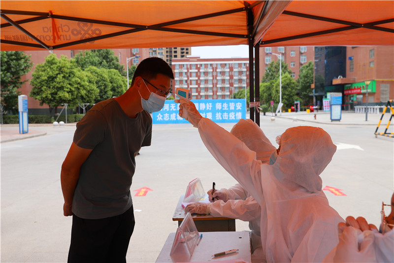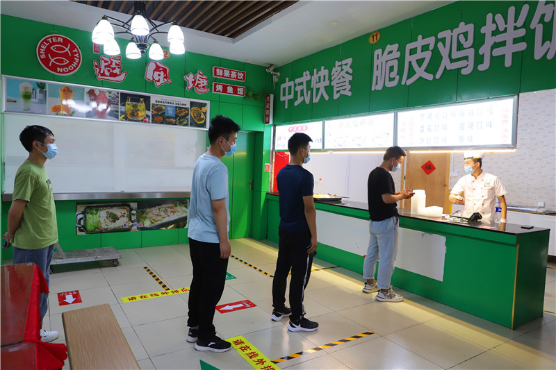 “请同学们站在地上标贴处,依次入校”,西校区、东校区几个校门都已做好了学生返校专用通道,第一批返校的学生体温检测后,有序的通过学生专用通道依次刷卡进入学校。在校门设置的应急处置帐篷内,校医院的医生深入一线,加强对同学的健康监测及医学处置。在学生报到点,每个学院都撑起了大大的遮阳伞,为排队报到的学子们挡住烈日的阳光。在食堂大厅,手部消毒、体温检测,一个都不少,丰富多样的套餐满足学生的不同需求。前来打饭的同学说:“虽然不能在大厅用餐,但是消毒进门、分时用餐,再加上丰富的菜品,让我们吃的很放心。”