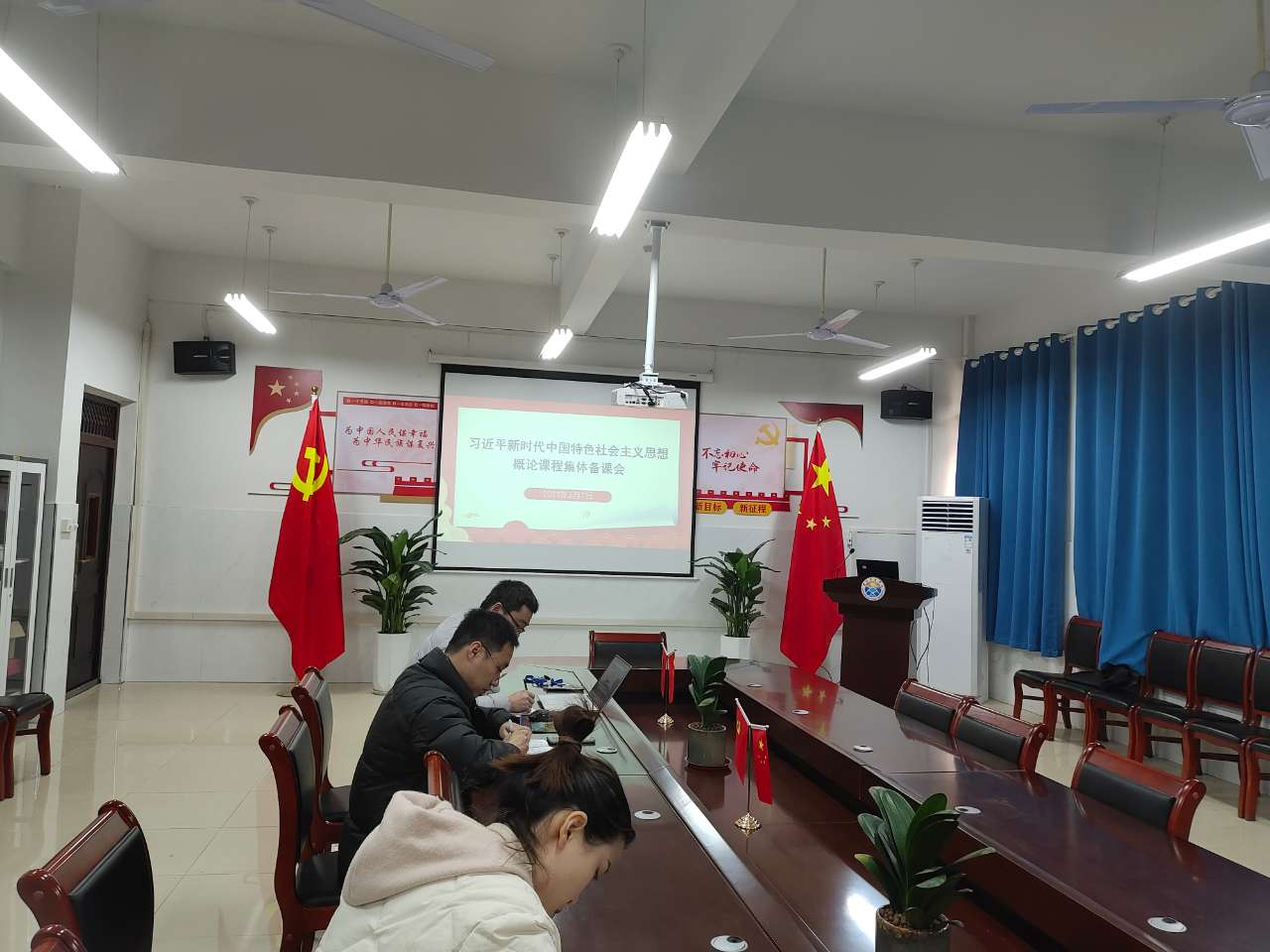 本次备课会主要包括两项议程:一是赵主任强调了新学期《习近平新时代中国特色社会主义思想概论》课程开设需要注意的事项,部署了开学前各项准备工作,包括准备好教学过程中所需的各项材料,如教学大纲、课本、教案、课件、教学进度计划表、教学过程考核记录等。